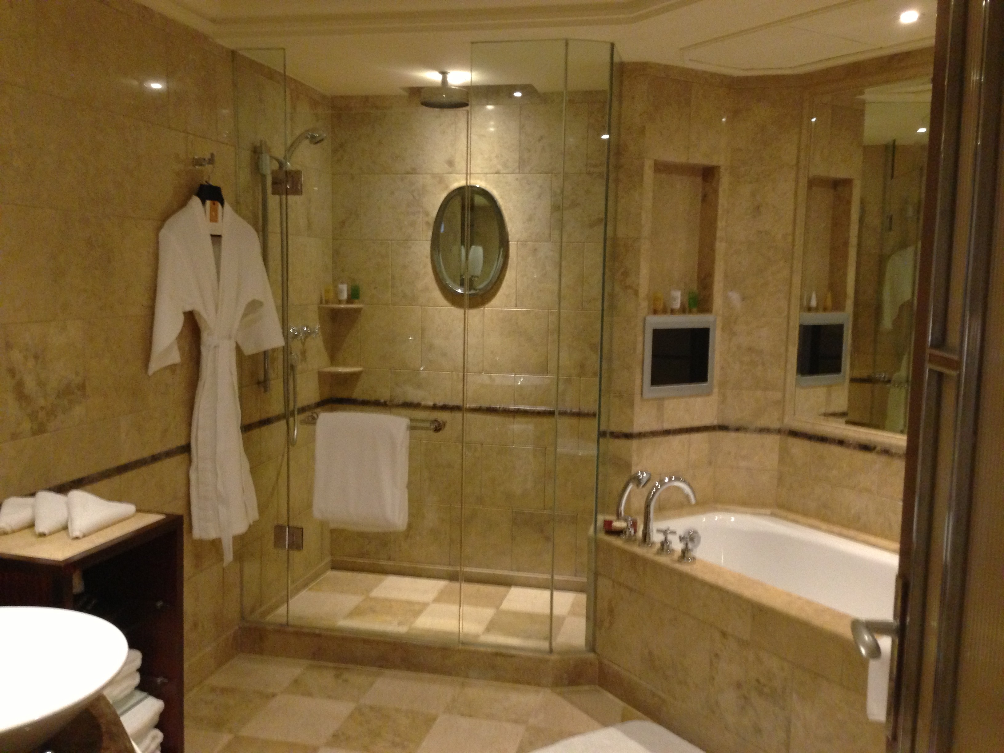 There is both a separate bathtub and shower, which is always something I like to see in a luxury hotel. The marble-heavy design is not especially modern, but it still feels appropriate for the property. More importantly, the bathroom is spacious and functional, and that fits the overall character of the hotel well.
